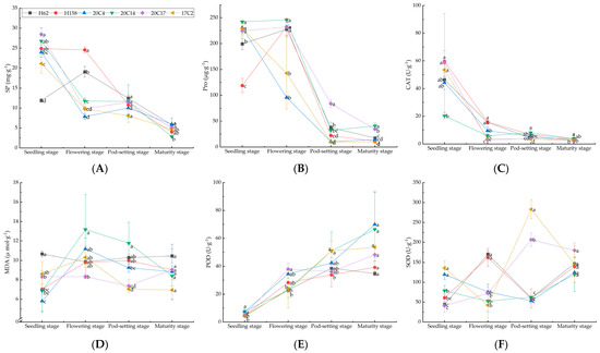 Osmotic regulatory substances and protective enzyme system activities of different rapeseed varieties at different growth stages under salt–alkali stress. (A) Proline (SP); (B) soluble protein (Pro); (C) catalase (CAT); (D) malondialdehyde (MDA); (E) peroxidase (POD); (F) superoxide dismutase (SOD). Values are presented as mean ± standard error (n = 3). Different lowercase letters indicate significant differences between treatments (p < 0.05).