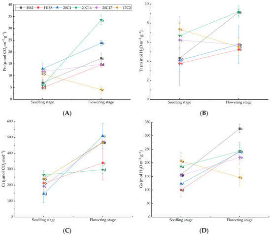 Plants can modulate stomatal conductance and transpiration rate, influencing the dynamic variations in photosynthetic rate. As depicted in Figure 4, throughout the growth period, with the exception of rapeseed variety 17C2, the Pn, Tr, Ci, and Gs of other rapeseed varieties exhibited an upward trend to varying extents. During the seedling stage, rapeseed variety 17C2 displayed the highest Tr, Ci and Gs, followed by 20C14; variety 20C4 had the highest Pn, whereas 20C14 and H158 had the lowest Pn, at 5.89 μmol CO2·m−2·g−1 and 4.83 μmol CO2·m−2·g−1, respectively. At the seedling stage, H158 exhibited the lowest of the four photosynthetic indices. During the flowering stage, the Ci of H62 was notably higher than that of the other varieties, 122.72% above the variety with the lowest concentration. The Pn and Tr of 20C14 exceeded those of the other varieties, being 725.55% and 67.15% higher than the variety with the lowest rates, respectively. The photosynthetic indices of 17C2 were lower than those of the other varieties. Consequently, at the flowering stage, 20C14 and H62 exhibited the best photosynthetic capacity, while 17C2 had the poorest photosynthetic capacity.
