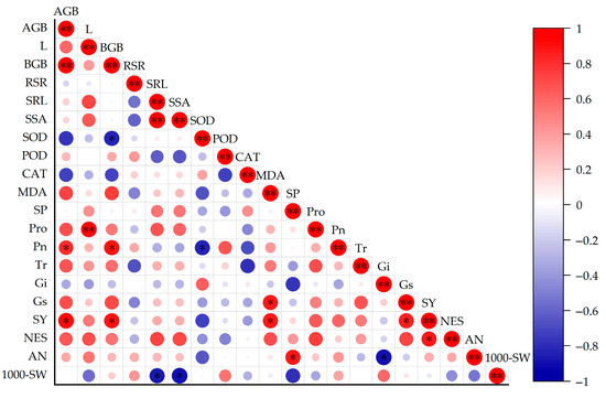 Upon examining the correlation coefficients of each index in Figure 5, it is evident that AGB exhibits an extremely significant positive correlation with BGB, SRL is extremely significantly positively correlated with SSA, and L is extremely significantly positively correlated with Pro, with respective correlation coefficients of 0.97, 0.99, and 0.92 (Appendix A (Table A1)). Additionally, five indexes are significantly positively correlated with SY: AGB (0.90), BGB (0.88), MDA (0.87), NES (0.87), and Gs (0.86) (Table A1), indicating that these indicators may have a synergistic effect in the growth of rapeseed and the physiological process of coping with salt–alkali stress, and are correlated and interact with each other. There are three indicators that are significantly or extremely significantly positively correlated with above-ground biomass, indicating that above-ground fresh weight and yield can be used as auxiliary indicators to measure the salt–alkali tolerance of rapeseed, which provides a basis for indirectly evaluating the salt–alkali tolerance of rapeseed through some easy-to-observe or easy-to-determine indicators. However, because there are also correlations of varying degrees between other indicators, and the role of each indicator in the salt–alkali stress of rapeseed is also different, further comprehensive analysis is needed to evaluate the salt–alkali tolerance of rapeseed. However, due to the different degrees of correlation between various indicators in the figure, each indicator plays a different role in the salt–alkali stress of rapeseed. If only a single indicator is used to evaluate the salt–alkali tolerance of rapeseed, the evaluation results may be biased due to the interrelationship between indicators and the diversity of roles, and the true salt–alkali tolerance of rapeseed cannot be fully and accurately reflected. Therefore, it is necessary to carry out the correction analysis of index traits. By comprehensively considering multiple indicators and their interrelationships, the weights and influences of various indicators are reasonably corrected and integrated, so as to evaluate the salt–alkali tolerance of rapeseed more scientifically and comprehensively.