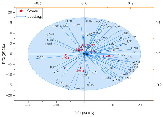 Principal component analysis of rapeseed under salt–alkali stress during the whole growth period. PC1 stands for the first principal component, and PC2 stands for the second principal component. Red dots represent different rapeseed varieties; blue arrows represent indicators related to salt–alkali tolerance; blue circles indicate the 95% confidence interval.