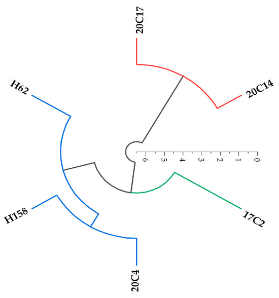 The membership function method was utilized to perform a comprehensive evaluation of six rapeseed varieties, with the results displayed in Table 3. The comprehensive evaluation values (D) for the six rapeseed varieties ranged from 0.498 to 7.381. Upon sorting, the varieties with D values from highest to lowest were 20C14, 20C17, 20C4, H62, H158, and 17C2. Cluster analysis was conducted on the six rapeseed varieties. It can be observed from Figure 7 that the six rapeseed varieties are divided into three branches of different colors. The shorter the branch, the closer the distance between the two varieties and the higher the feature similarity. The branches of 20C14 and 20C17 are shorter, indicating that their salt–alkali tolerance features are more similar; the branches of H158 and 20C4 are also short, and their salt–alkali tolerance features are also more similar, while the branch of 17C2 is long compared with other varieties, indicating that its salt–alkali tolerance features are quite different from those of other varieties. Therefore, the salt–alkali tolerance of rapeseed is divided into three categories: the first category with the strongest salt–alkali tolerance includes varieties 20C14 and 20C17, the second category with general salt–alkali tolerance includes varieties H62, 20C4, and H158, and the third category with the weakest salt–alkali tolerance is 17C2. By conducting cluster analysis on the six rapeseed varieties, varieties with similar salt–alkali tolerance features can be grouped into one category according to the differences in their performance in indicators related to salt–alkali tolerance. Thus, the strength levels of salt–alkali tolerance of different rapeseed varieties can be clearly and intuitively divided, which is convenient for quickly identifying excellent varieties with strong salt–alkali tolerance. It provides a more targeted basis for the screening, breeding, and research on the salt–alkali tolerance mechanism of salt–alkali-tolerant rapeseed varieties, and also helps to carry out more in-depth relevant experiments and application explorations according to different salt–alkali tolerance categories in the future.