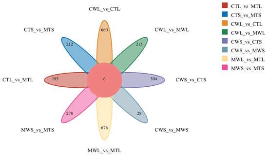 Venn diagram of DEGs in eight different groups. Abbreviations: C (without MeJA treatment) and M (with MeJA treatment); W (non-transgenic plants) and T (transgenic plants); S (small flower size) and L (large flower size).
