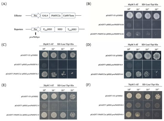 The results of yeast one-hybrid assay. (A) Schematic of vectors used in Y1H assays; (B) PhMYC2a binds the promoter of PhHsp16.0A; (C) PhMYC2a binds the promoter of PhHsp16.1; (D) PhMYC2a binds the promoter of PhHsp16.8; (E) PhMYC2a binds the promoter of PhHsp21.9; (F) PhMYC2a may bind the promoter of PhHsp40.8.