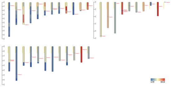 The 38 members of the PaHsp20 family of petunia are distributed on 34 chromosome scaffolds (Figure 4), the chromosomes are populated by gene density, with bluer colors representing fewer gene sequences and redder colors representing denser gene sequences. Meanwhile, it can be found that genes on the same chromosome, such as PaHsp18.0B, PaHsp18.0C, and PaHsp35.7; PaHsp31.8 and PaHsp16.4 are the closest to each other on the branches of the evolutionary tree and belong to the same subfamily, so we speculate that they may have similar functions. However, PaHsp16.1 and PaHsp20.1, which are also on the same chromosome, belong to subfamilies CIV and CIX, respectively.