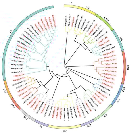 A phylogenetic tree was constructed using Hsp20 protein sequences from O. sativa, A. thaliana, and the above 38 PaHsp20, totaling 79 protein sequences, for sequence alignment (Figure 5). According to the evolutionary branching, the resulting tree revealed that 29 PsHsp20 genes (76.3%) could be classified into 13 subfamilies based on evolutionary branching and established nomenclature from A. thaliana and O. sativa, except for the unclassified Hsp20. The largest subgroup, CI, contained eight genes, followed by subfamilies CII, CVIII, CIX, MII, and ER with three genes each. Two genes were assigned to both CIV and CVI, while single-gene representation was observed in CIII, CV, CVII, P, and Px. The remaining nine genes (23.7%) exhibited substantial sequence divergence and could not be assigned to known subfamilies. Among these unclassified members, seven (PaHsp14.4, PaHsp17.5, PaHsp24.2, PaHsp26.2, PaHsp28.8, PaHsp30.3, and PaHsp41.6) formed a distinct cluster designated unknown localization one, while two (PaHsp35.6 and PaHsp35.9) comprised unknown localization two.