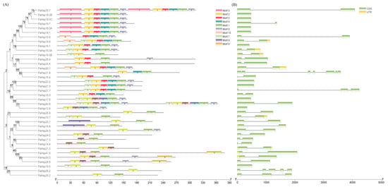 The CDS and UTR fragments of the 38 sequences obtained from the analysis (Figure 6B), each of which has two or more CDS fragments. However, PaHsp16.8, PaHsp41.6, and PaHsp30.3 had 5′ UTR region; PaHsp18.6, PaHsp16.0A, PaHsp15.7, and PaHsp25.1 had 3′ UTR region; and PaHsp16.0B, PaHsp20.1, and PaHsp21.3 have UTR regions at both 3′ and 5′ ends. Although the UTR acts as an untranslated region and is not a protein coding region, the upstream readable frames within the 5′ UTR region can be translated into polypeptides with transcriptional regulation. A total of 10 (26.3%) PaHsp20 had no introns, 24 (63.2%) PaHsp20 had one intron, two (5.3%) PaHsp20 had two introns, PaHsp26.2 had four introns, and PaHsp31.8 had six introns.