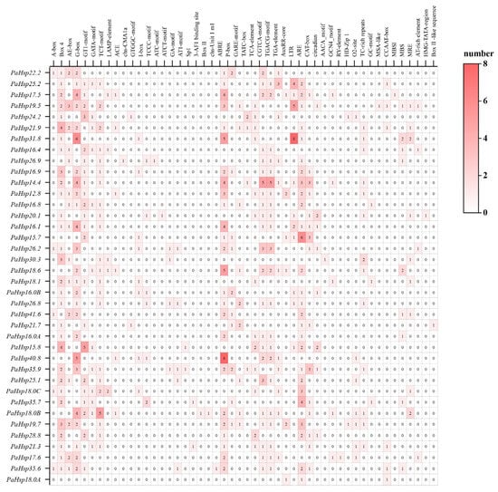 Number of cis-acting elements in the promoter of the PaHsp20 gene family. The basic core sequences TATA-box and CAAT-box are not included in the figure; colors from white to red represent increasing numbers from 0 to 8.