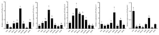 The expression patterns of PhHsp20 genes in different petunia tissues. The RNA samples of roots, stems, leaves, flowers, sepal, corolla, stamens, and pistils were extracted from P. hybrida ‘Michelle’. The expression levels of PhHsp20 genes were detected by the 2−ΔΔCt method with petunia EF-1α gene as the internal control, and the expression in the root was defined as one. The data were calculated from three replications and presented as mean values ± standard error. Different lowercase letters indicate significant differences in Tukey multiple comparisons (p < 0.05).
