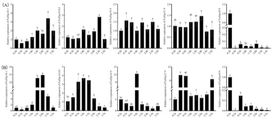 Developmental stage expression patterns of PhHsp genes during the growing processes of flower buds and anthers have been demonstrated represented by different length flower buds. The results of flower buds are shown in Figure 9A. PhHsp40.8, PhHsp16.1, and PhHsp16.0A genes had extremely high expression levels at periods of 0.2b, 2.5b, and 2.5b, respectively. However, they were relatively low at other periods, implying that these PhHsp genes might play important roles in such periods. On the contrary, PhHsp16.8 and PhHsp21.9 gene expression levels were relatively average in each period, suggesting that these genes might play a significant and continuous role during the bud development.