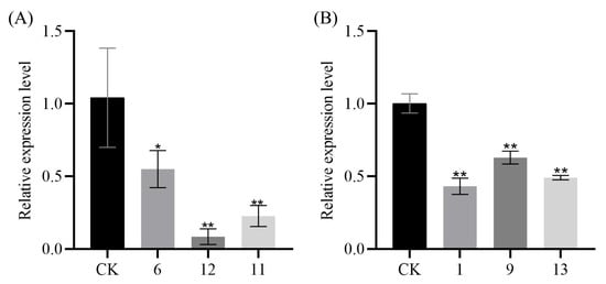 The qRT-PCR results of VIGS assay. (A) Expression levels in CK and pTRV2-PhHsp16.0A transgenic petunia plants; (B) expression levels in CK and pTRV2-PhHsp16.1 transgenic petunia plants. The expression levels of PhHsp genes were detected by the 2−ΔΔCt method with petunia EF-1α gene as the internal control. Asterisks represent statistically significant differences (* p < 0.05 and ** p < 0.01) as determined by Student’s t test.