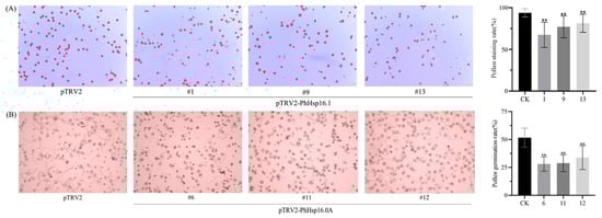 The result of pollen fertility test assay. (A) Pollen examination conducted by germination test from CK and line 1, 9, 13 of pTRV2-PhHsp16.1 transgenic petunia plants; (B) Pollen examination conducted by staining test from CK and line 6, 11, 12 of pTRV2-PhHsp16.0A transgenic petunia plants; Asterisks represent statistically significant differences (** p < 0.01) as determined by Student’s t test.