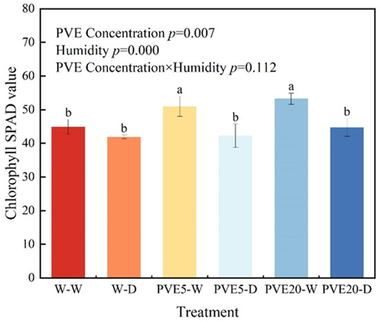 Chlorophyll SPAD values of pear trees under different treatments. Different lowercase letters above the bars indicate significant differences between treatments at p < 0.05. The results of a two-way ANOVA for PVE concentration, water regime, and their interaction are shown. W-W: deionized water application under well-watered conditions; W-D: deionized water application under drought stress; PVE5-W: 5 ng/mL PVE application under well-watered conditions; PVE5-D: 5 ng/mL PVE application under drought stress; PVE20-W: 20 ng/mL PVE application under well-watered conditions; PVE20-D: 20 ng/mL PVE application under drought stress. The same below.