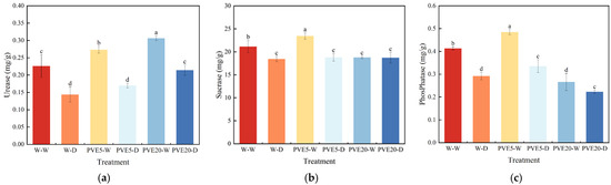 Under drought conditions, soil urease activity showed a gradient change, with the W-D treatment displaying the lowest activity and the PVE20-D treatment the highest. Sucrase activity did not differ significantly among the PVE treatments (p > 0.05). PVE5-D treatment had 17.24% and 54.55% higher phosphatase activity than those of the W-D and PVE20-D treatments, respectively.