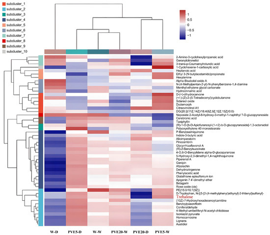 Hierarchical clustering analysis of root metabolite profiles under different treatments. The heatmap displays relative metabolite abundance (color scale: −1 = low, 1 = high) with metabolites grouped into 10 distinct subclusters (subcluster_1 to subcluster_10) based on accumulation patterns. The Euclidean algorithm was used, and the top 50 metabolites with differential expression levels were selected for clustering to more intuitively display the variation trends of differential metabolites within the same group. On the left side of the figure is a dendrogram showing the clustering of metabolites in the samples. The closer two metabolite branches are to each other, the more similar their expression levels are. At the top of the figure is a dendrogram representing the clustering of samples. The closer two sample branches are, the more similar the expression patterns of all metabolites in these two samples are—specifically, the more consistent the variation trends of metabolite expression levels are. For abbreviations of treatments, see Figure 1.