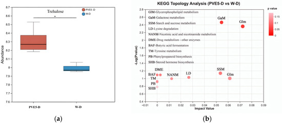 Trehalose accumulation and KEGG pathway enrichment in response to PVE5 treatment under drought stress. (a) Trehalose content in rhizosphere soil under drought conditions: PVE5-D (5 ng/mL PVE) vs. W-D (deionized water). (b) KEGG topology analysis of enriched metabolic pathways in PVE5-D vs. W-D comparison. * Note: significant difference between PVE5-D and W-D treatments in trehalose production.