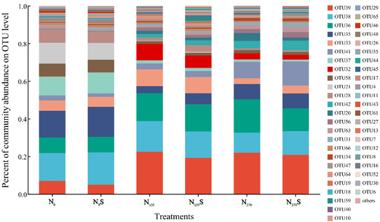 This investigation identified a total of 68 operational taxonomic units (OTUs) associated with ammonia-oxidizing archaea (AOA), with 47 OTUs consistently detected across all treatments (Figure S1). Only 3 OTUs were found exclusively in specific treatments, suggesting a limited variability within the AOA community across the experimental treatments. However, significant variations in relative abundance of AOA OTUs among treatments were observed clearly (Figure 1). The changes in the relative abundance exceeding 0.1% of AOA OTUs demonstrated a marked decline in the relative abundance of numerous OTUs, particularly OTU 35, 37, 58, 21, and 28, following fertilization regimes. Compared to the N0 and N0S treatments, their relative abundances decreased in the N135, N135S, N270, and N270S treatments. In contrast, OTU 39, identified as the most prevalent in fertilized soil samples, demonstrated a positive response to both low and high fertilization. Furthermore, OTU 41 had the highest relative abundance in the N270S treatment, whereas OTU 36 showed a significant increase in the N270 treatment. These results indicated that despite the overall similarity in composition in the composition of AOA community, differences in the key relative abundance of core AOA OTUs among different treatments may contribute to the observed fluctuations in soil nitrification.