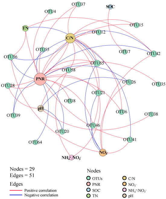 AOA is widely distributed in environments such as soils, oceans, and artificial ecosystems [33]. Due to the significant habitat specificity of different AOA groups [34,35], differentiating core and non-core groups within the AOA community is essential to better understand their role in ecosystem function. In this study, network analyses revealed that only a portion of the AOA community was closely linked to soil nitrification. Although 47 OTUs were detected in all treatments (Figure S1), only 22 OTUs had strong correlations (r > 0.7) with soil properties and potential nitrification rate (PNR). These results suggest that focusing solely on the entire AOA community may obscure the nuanced contributions of core OTUs to nitrification [36].