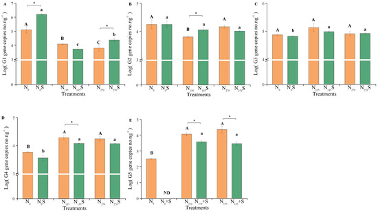 Quantification of AOA core clusters in different treatments. Uppercase and lowercase letters represent significant differences between fertilization treatments without and with straw, respectively (p < 0.05). “*” indicates significant differences between straw samples (p < 0.05). “ND” represents non-detection. G1, G2, G3, G4, and G5 represent different clusters within the AOA core clusters. (A) G1; (B) G2; (C) G3; (D) G4; (E) G5.