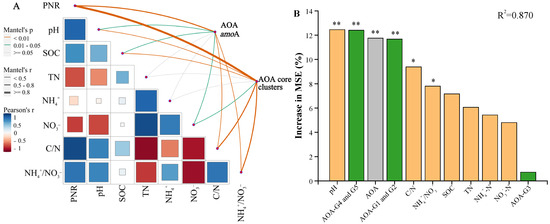 Mantel test analysis assessed correlations between soil properties and the absolute abundances of the AOA amoA gene and AOA core clusters using the linkET package in R software (version 4.1.1) [32], and false discovery rate (FDR) corrections were applied to the resulting p-values. A random forest analysis was used to evaluate the relative importance of key variables influencing soil PNR using the randomForest package. The importance of variables was indicated by higher percentage increases in the mean squared error (MSE), and the significance of the model and variables was assessed using the A3 and rfPermute packages of R, respectively.