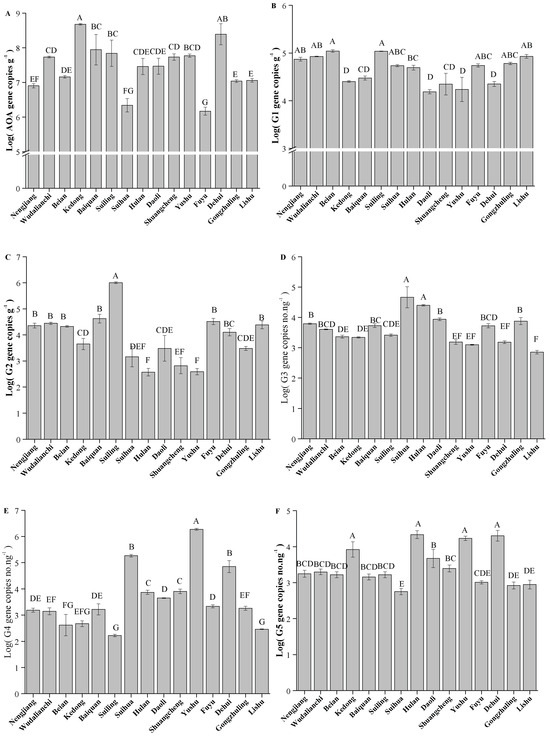 Quantification of AOA amoA and AOA core clusters in Typical Black Soil Zone. The letters represent significant differences between samples (p < 0.05). G1, G2, G3, G4, and G5 represent different clusters within the AOA core clusters. (A) AOA amoA; (B) G1; (C) G2; (D) G3; (E) G4; (F) G5.