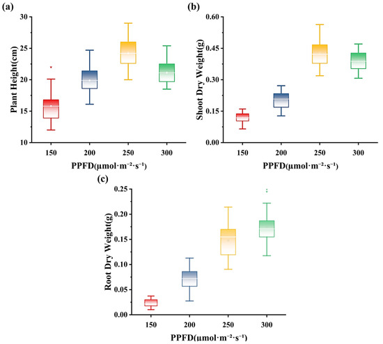 Effects of light intensity on the biomass of alfalfa seedlings. (a–c) Plant height, shoot dry weight, and root dry weight of the alfalfa seedlings, respectively. The arrows show outliers.