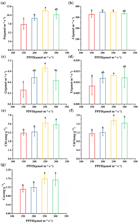 Compared with those in the other light intensity treatments, the contents of photosynthetic pigments (Chl a, Chl b, and Car) in the leaves of the alfalfa seedlings significantly increased under the light intensity treatments of 250 μmol·m−2·s−1 and 300 μmol·m−2·s−1, but no significant difference was detected between the two treatments.