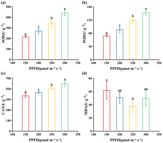 Effects of light intensity on the antioxidant biochemical parameters of alfalfa seedlings. (a–d) Superoxide dismutase (SOD), peroxidase (POD), catalase (CAT) and malondialdehyde (MDA) levels, respectively. Different letters indicate significant differences from each other at p < 0.05 according to the LSD-t test.