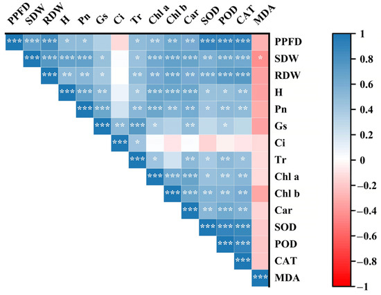 Pearson correlation analysis between the growth and physiological indicators of alfalfa seedlings under different light intensities. Blue indicates a positive correlation, and red indicates a negative correlation. Shoot dry weight, SDW; Root dry weight, RDW; Plant height, H; Net photosynthetic rate, Pn; Stomatal conductance, Gs; Intercellular CO2, Ci; Transpiration rate, Tr; Chlorophyll a, Chl a; Chlorophyll b, Chl b; Carotenoid, Car; Superoxide dismutase, SOD; Peroxidase, POD; Catalase, CAT; and Malondialdehyde, MDA. *, p < 0.05; **, p < 0.01; ***, p < 0.001.