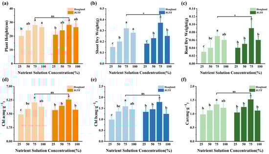 Effects of nutrient solutions on the growth and photosynthetic pigments of alfalfa seedlings. (a–c) Plant height, shoot dry weight, and root dry weight of the alfalfa seedlings. (d–f) Chl a, Chl b, and Car. Different letters indicate significant differences from each other at p < 0.05 according to the LSD-t test. *, p < 0.05; ns, not significant, according to Tukey’s HSD test.