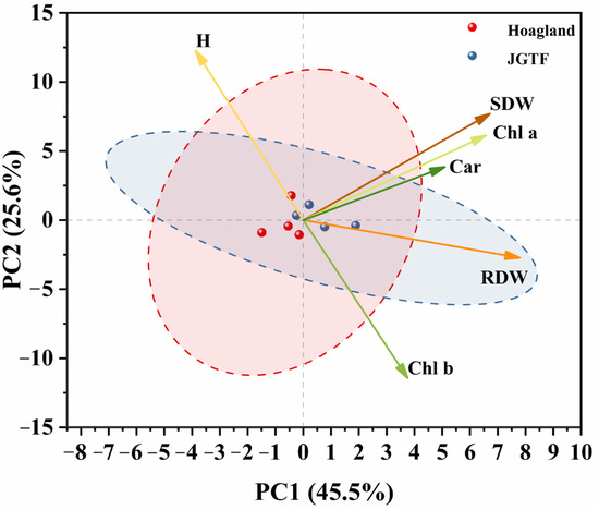 Biplot of PCAs describing the correlation between the evaluated traits in response to different nutrient solutions. Shoot dry weight, SDW; Root dry weight, RDW; Plant height, H; Chlorophyll a, Chl a; Chlorophyll b, Chl b; and Carotenoid, Car. The vectors represent individual parameters, where the length of each line indicates the relative contribution of the parameter to the principal components, and the angle between lines reflects the degree of correlation among parameters (<90°, positive correlation; =90°, no correlation; >90°, negative correlation). The ellipse indicates the region within which the sample set is distributed with 95% confidence. Samples from Hoagland and JGTF are marked in red and blue, respectively.