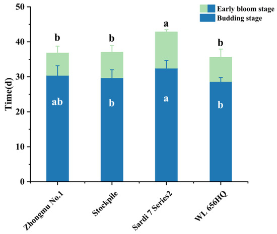 After establishing the optimal cultivation parameters, flowering time was assessed in alfalfa cultivars with varying fall dormancy (FD) levels: ‘Zhongmu No. 1’ (FD 2), ‘Stockpile’ (FD 4), ‘Sardi 7 Series 2’ (FD 7), and ‘WL 656HQ’ (FD 9) (Figure 7). The results showed that, under optimal conditions, cultivars generally exhibited no significant differences in the timing of budding or initial flowering, except for ‘Sardi 7 Series 2’. Compared with the ‘Zhongmu 1’, the ‘Sardi 7 Series 2’ did not significantly differ in the time to reach the budding stage. Across all cultivars, budding and initial flowering occurred at approximately thirty and thirty-seven days, respectively, with a bud-to-flowering interval of about eight days. These findings indicate that the optimized conditions could be applied to the rapid cultivation and breeding of different FD varieties of alfalfa plants.