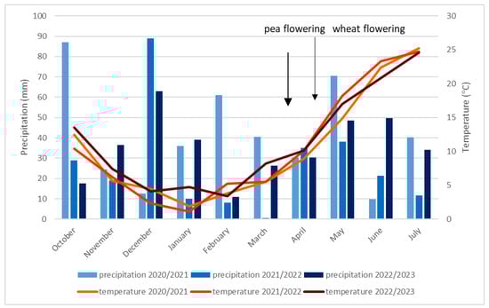 In the first growing season (2020/2021), it was rainy weather at the time of sowing, which had a favorable effect on the initial development of both companion plants. Later, the drier November and December and the lack of winter snow caused a decrease in soil water balance. April 2021 was not optimal in terms of the water needs of peas, but the rainfall in May proved to be enough for its development, which was facilitated the differentiation of the wheat ears. We measured very little precipitation in June, which mainly affected wheat sensitively. In contrast, the second growing season (2021/2022) was characterized by extreme, uneven rainfall distribution. The vegetation period started with much less rainfall than usual, which was critical for the development of both plants despite the heavy rains in December. Then, a strong lack of precipitation that occurred during the pea flowering period affected the plant in its most sensitive phase. This phenomenon had a negative effect on the formation of the number of ears, too. The wetter April and May were more favorable than this, which covered the maximum water demand for the development of the companion plants. The rainfall during the grain-filling period of wheat was less than the optimal level. The third growing season had the least amount of precipitation at the time of sowing. This initial disadvantage was significantly alleviated by the rainfall of the winter months. After that, another slightly drier period began in the spring of 2023, which did not benefit either species. Although the rainfall distribution was not as extreme as the previous year, the lack of rainfall occurred in the critical stages of the companion plants.