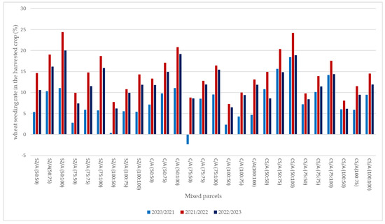 The proportion of wheat in the final crop in each growing season increased by an equivalent amount to the decrease in pea yield. There was only one mixture in 2020/2021, when the proportion of wheat became less than the original seeding rate. According to Bedoussac et al. [