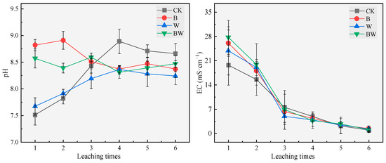 Trends in the pH and EC of the leachate solution. CK treatment group: no amendment materials were applied to the soil; B treatment group: biochar was applied to the soil at a rate of 20 g·kg−1; W treatment group: compost was applied to the soil at a rate of 40 g·kg−1; BW treatment group: biochar and compost were applied to the soil at a rate of 20 g·kg−1 for biochar and 40 g·kg−1 for compost.