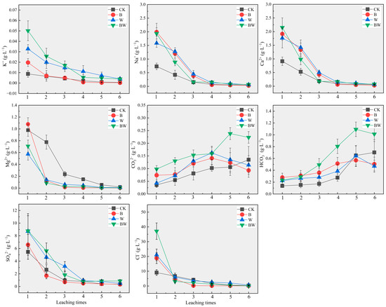 Trend of the ion content in the leaching solutions after the different treatments. CK treatment group: no amendment materials were applied to the soil; B treatment group: biochar was applied to the soil at a rate of 20 g·kg−1; W treatment group: compost was applied to the soil at a rate of 40 g·kg−1; BW treatment group: biochar and compost were applied to the soil at a rate of 20 g·kg−1 for biochar and 40 g·kg−1 for compost.