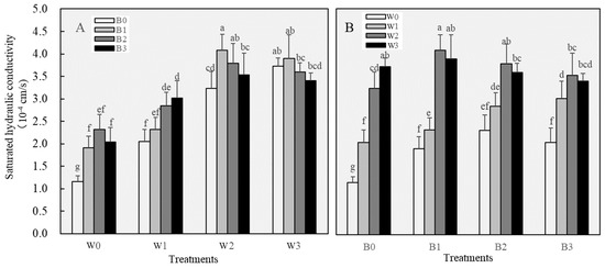 Effects of biochar and compost on the saturated hydraulic conductivity of coastal saline soils. (A) shows the change in soil hydraulic conductivity with increasing biocarbon application at a fixed amount of compost; (B) shows the change in soil hydraulic conductivity with increasing compost application at a fixed amount of biochar. Note a: Four levels of biochar: 0, 10, 20, and 40 g·kg−1, denoted as B0, B1, B2, and B3, respectively; four levels of compost: 0, 20, 40, and 80 g·kg−1, denoted as W0, W1, W2, and W3, respectively. The values in the figure are the means ± standard deviations, and different letters indicate significant differences between treatments at the 0.05 level.