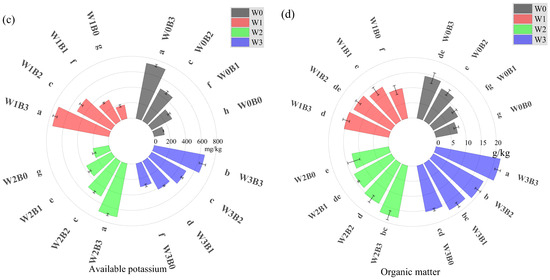 The available nitrogen content of the treatments ranged from 39.14 to 104.93 mg·kg−1 (Figure 7). At lower levels of compost application, the available nitrogen content did not differ significantly among the different levels of biochar; when the application level of compost was greater, the available nitrogen content tended to increase with increasing biochar application, and that of B3 was significantly greater than that of B0. The available nitrogen content tended to increase significantly with increasing compost application. The available phosphorus content of coastal saline soil gradually increased with increasing compost application, but the available phosphorus content tended to increase slightly with increasing biochar application. The B2W0 treatment had the lowest available phosphorus content (4.11 mg·kg−1), and the B3W3 treatment had the highest available phosphorus content (19.71 mg·kg−1). The content of available potassium in the soil gradually increased with increasing compost application, and when the application level of biochar was high, the content of available potassium in the soil tended to decrease with increasing compost application, and there was no significant difference among the treatments. The content of available potassium increased significantly with increasing biochar application, and there were significant differences among the treatments. All the treatments significantly increased the content of available potassium in coastal saline soils, with B3W1 showing the greatest increase of 604.28 mg·kg−1. The organic matter content gradually increased with increasing biochar and compost application. In comparison, compost contributed more to the increase in organic matter content. The organic matter content of all the treatments was significantly greater than that of B0W0, except that the difference between B1W0 and B0W0 was not significant. The organic matter content of all the treatments was the highest in B3W3 and the lowest in B0W0, with values of 21.92 and 7.39 g·kg−1, respectively.