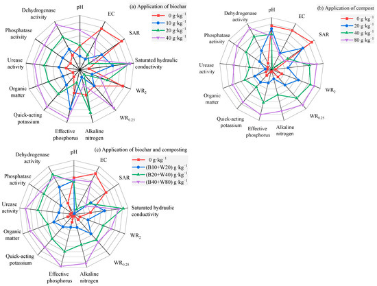 A comparative analysis of the effects of biochar and compost application on saline soils via radar charts (Figure 8) revealed that their application not only increased the nutrient content in the soil but also significantly increased the enzyme activities in the soil. In addition, it also reduced the salinity and pH of the soil. However, the application of biochar and compost should be properly controlled to avoid excessive application.