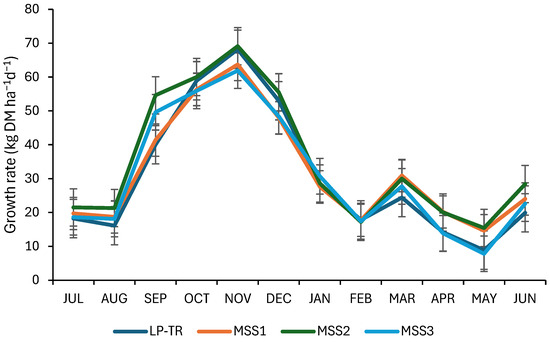 During the winter, the daily pasture growth rate (kg DM ha−1 day−1) was significantly higher for the multispecies pastures (MSSs) compared to the LP-TR (Figure 1; p < 0.0001). On average, during the spring—the primary grazing season at the study site—the growth rate of MSS2 was 59.6 kg DM ha−1 day−1, which was significantly higher (p = 0.0007) than that observed for MSS1 and MSS3, but similar to LP-TR. Peak daily growth rates were observed in November, with LP-TR (68.2 kg DM ha−1 day−1) and MSS2 (69.1 kg DM ha−1 day−1) exhibiting significantly higher growth rates (p < 0.0001) than MSS1 and MSS3 (63.7 and 61.9 kg DM ha−1 day−1, respectively). During the summer, a period of very low precipitation in the experimental site, no significant differences (p > 0.05) in daily growth rates were observed among the different pastures. During autumn, the growth rates of MSS1 and MSS2 were 29% higher (p < 0.0001) than those observed for LP-TR and MSS3.