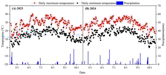 Precipitation (blue bar), daily maximum temperature (red line), and daily minimum temperature (black line) during cotton growth period in 2023 (A) and 2024 (B).