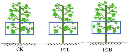 The field experiment was conducted in a randomized block design with three replicated groups. The source–sink processing method refers to Luo et al. [31] with some improvements. Including a no cutting source and sink treatment (CK), cutting 1/2 leaves per plant (1/2L) and cutting 1/2 bolls per plant (1/2B), which were applied at the initial flowering stage (IFS), flowering and boll stage (FABS) and full boll stage (FBS), respectively. Treatments were applied to all plots throughout the season. The specific time of treatment are listed in Table 1. The phenotypes were shown in Figure 2.