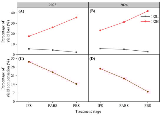 The percentage of yield loss (A,B) and compensation rate (C,D) of cotton under different source–sink treatments in 2023 and 2024. The IFS, FABS, and FBS are represented initial flowering stage, flowering and boll stage and full boll stage, respectively.