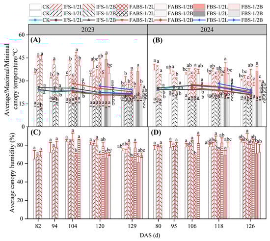 Effects of the source–sink treatments on the cotton canopy temperature (A,B) and humidity (C,D) in the 2023 and 2024 growing seasons. The black column diagram, red column diagram, and line diagram represent the minimum temperature, maximum temperature, and average temperature of the canopy, respectively. The IFS, FABS, and FBS are represented initial flowering stage, flowering and boll stage and full boll stage, respectively. Different lowercase letters indicate significant difference for a parameter between treatments at p < 0.05.