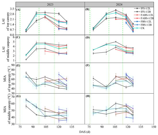 Dynamic change in LAI of top and middle canopy (A–D), MIA of top and middle canopy (E–H) for cotton grown under source–sink treatments during the 2023 and 2024 growing seasons. The IFS, FABS, and FBS are represented by initial flowering stage, flowering and boll stage, and full boll stage, respectively. The green dotted lines in the figure represent the processing times of the three source–sink, respectively.
