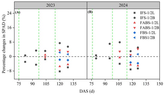 Percentage change in SPAD (A,B) for cotton grown under six source–sink treatments (IFS-1/2L, IFS-1/2B, FABS-1/2L, FABS-1/2B, FBS-1/2L, FBS-1/2B) during the 2023 and 2024 growing seasons compared with CK. The IFS, FABS, and FBS are represented initial flowering stage, flowering and boll stage and full boll stage, respectively. The green dotted lines in the figure represent the processing times of the three source–sink, respectively.