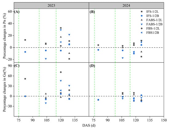 Percentage change in photosynthesis (A–D) for cotton grown under six source–sink treatments (IFS-1/2L, IFS-1/2B, FABS-1/2L, FABS-1/2B, FBS-1/2L, FBS-1/2B) during the 2023 and 2024 growing seasons compared with CK. The IFS, FABS, and FBS are represented initial flowering stage, flowering and boll stage and full boll stage, respectively. The green dotted lines in the figure represent the processing times of the three source–sink, respectively.