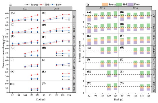 Effects of the source–sink treatments on biomass accumulation (a) and allocation (b) of cotton in the 2023 and 2024 growth seasons. The IFS, FABS, and FBS are represented initial flowering stage, flowering and boll stage and full boll stage, respectively.