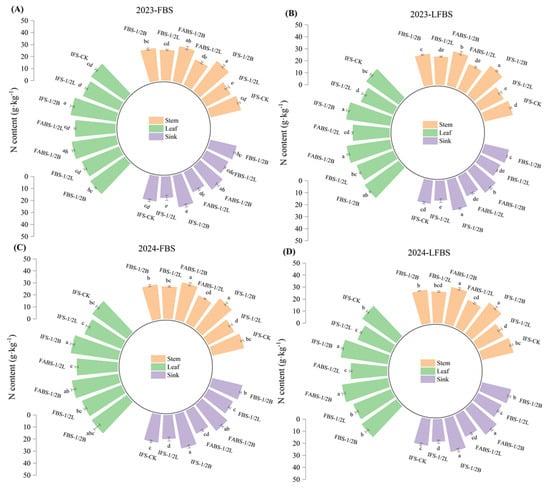 N content in organs of cotton at full boll stage (A,C) and later full boll stage(B,D) under different source–sink treatments in 2023 and 2024. The IFS, FABS, and FBS are represented initial flowering stage, flowering and boll stage and full boll stage, respectively. Different lowercase letters indicate significant difference for a parameter between treatments within the same year at p < 0.05.