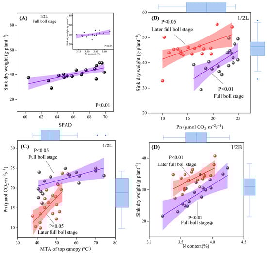 In 1/2L treatment, a strong positive correlation between N content, SPAD, and sink dry weight was observed during full boll stage in this study (Figure 10A). Moreover, during the full boll stage and later full boll stage, the sink dry weight was positively correlated with Pn and the top-canopy MTA was positively correlated with Pn (Figure 10B–C). In 1/2B treatment, the N content and sink dry weight were fitted separately according to the measurement period at the full boll and late full boll of cotton growth. N content was significantly correlated with the sink dry weight, but the increase in sink dry weight at the full boll stage contributed significantly more to N content than at the late full boll stage (Figure 10D). Thus, the variation in N content of leaf caused by source–sink regulation is of importance for determining the sink dry weight.