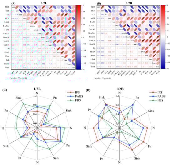 Heat map showing the correlation analysis between the various factors. The correlation of each factor under 1/2L treatment (A); The correlation of each factor under 1/2B treatment (B); Asterisks (*) indicate the level of significance: * p < 0.05, ** p < 0.01. Radar plots indicating dry matter weight of the sink, N content of leaves and Pn changes under 1/2L (C) and 1/2B (D) treatments during full boll stage and later full boll stage. The initial flowering stage, flowering and boll stage and full boll stage are represented in the figure as IFS, FABS, and FBS, respectively.